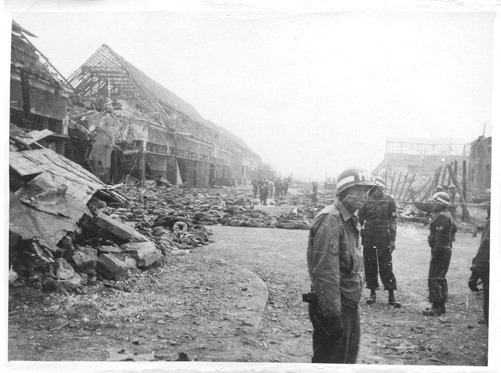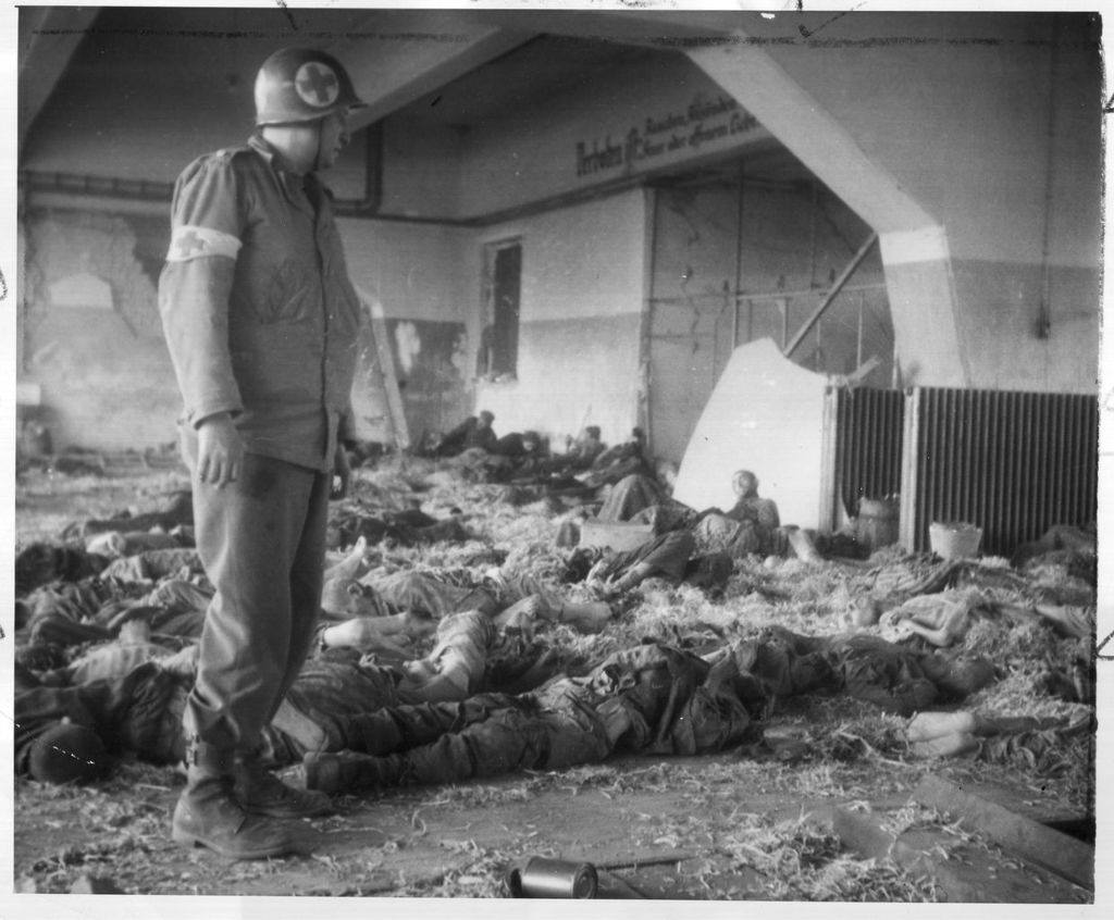 On 11 April, advance parties of the US 3rd Armored Division entered Nordhausen with little opposition. They found hundreds of dying prisoners lying amongst more than a thousand corpses, including many children and babies at Boelcke Kaserne. Some had been dead before the air raid; others were killed during the raid, or by neglect afterwards. The American soldiers were outraged; one wrote, “No written word can properly convey the atmosphere of such a charnel house, the unbearable stench of decomposing bodies, the sight of live human beings… lying cheek by jowl with the ten-day dead…” A 15 April report describes the camp as “the most horrifying example of Nazi terrorism imaginable”. The 3rd Armored Division continued eastward and was replaced on the morning of 12 April by the 104th Infantry Division.