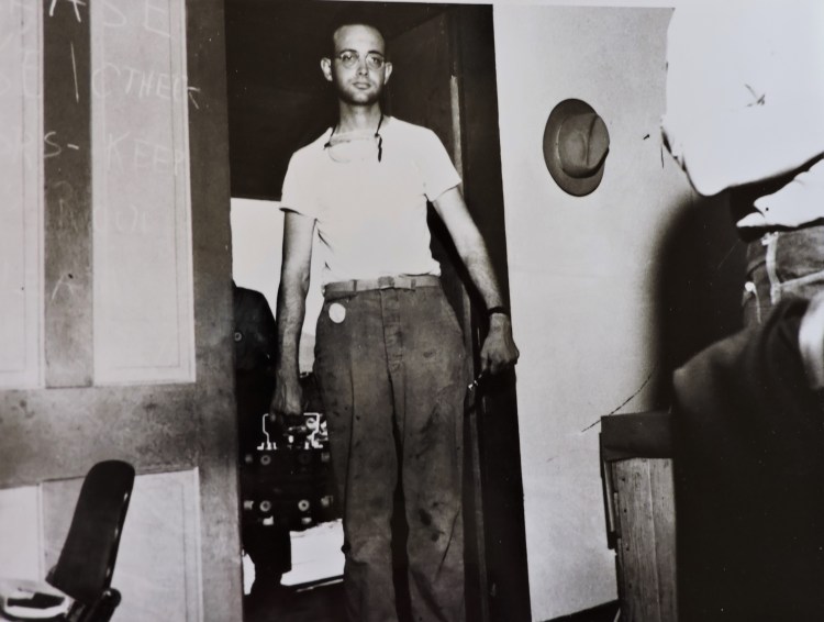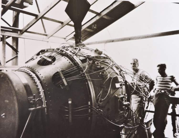 The uranium slug was cut in half with a spherical cup in the bottom half to hold the plutonium core and initiator. The two halves were then put together and placed in a box with holes in it for cooling. It sat in the assembly room at the ranch house until the next day when it was taken to ground zero to be inserted into the high explosive components that had been delivered from Los Alamos.