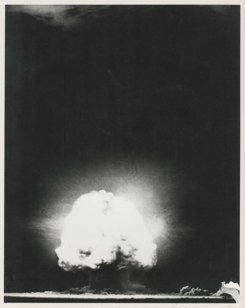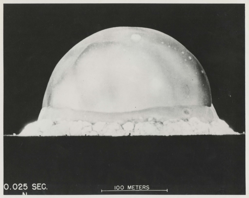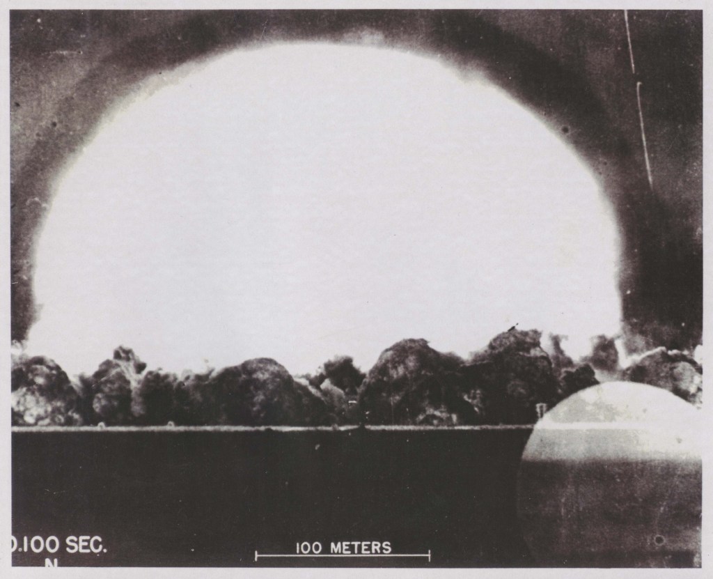 In the intense breathless quiet, Sam Allison’s voice counted down, “5…4…3…2…1. NOW.” Without a sound at exactly 05:29:45 Mountain War Time on 16 July 1945, mankind dove into the unknown and emerged in the Atomic Age. The device exploded with a yield of 21 kilotons, or 21,000 tons of TNT. There was a flash of light, followed by the shock wave and the roar of the explosion. It was as though the sun was shining as the first flash lasted more than ten seconds, followed by an enormous ball of fire for another ten seconds, then the billow of smoke and a second flash that lasted around four seconds.