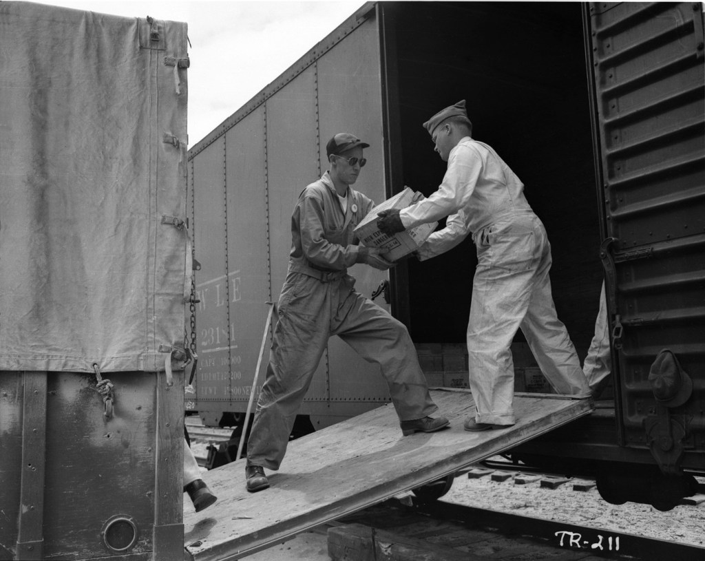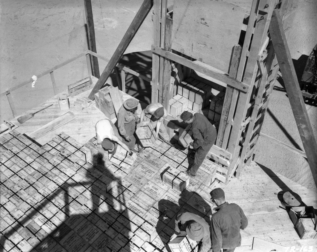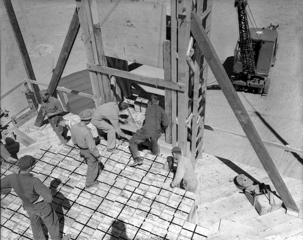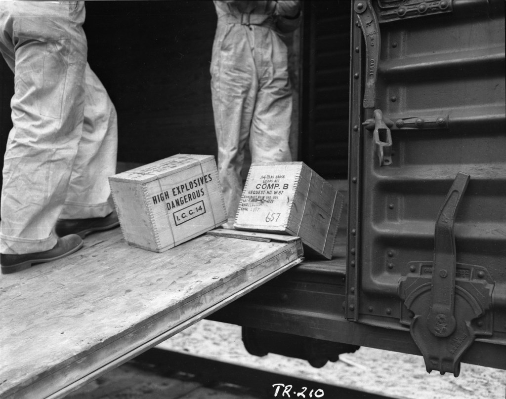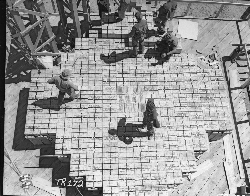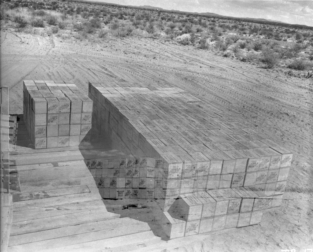 On 7 May 1945, soldiers and technicians stacked a little more than 100 tons of high explosives on a 20-foot platform for a calibration and procedures check. The explosives, mostly sourced from Fort Wingate, New Mexico, was comprised of 3,590 boxes of TNT and 774 boxes of Composition B, abbreviated as “Comp B.” The total weight was 89.75 tons of TNT and 14.91 tons of Comp B, a bit more than the rounded off number of 100 tons. A relatively small amount of explosives was set aside for additional calibration testing. The known explosive quantity provided a benchmark for seismographs, blast gauges, and other instruments. A small amount of radioactive material made from a dissolved slug from the Hanford, Washington facility was threaded through the stack in tubing to calibrate other instruments.
