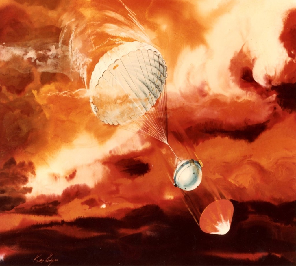 Figure 1 is an artist’s rendition of the Galileo Atmospheric Probe penetrating the Jovian atmosphere. The scene depicts the heat shield being ejected (lower right) and the parachute slowing down the deceleration module aeroshell (instrumentation section) prior to collecting data on Jupiter’s atmosphere.