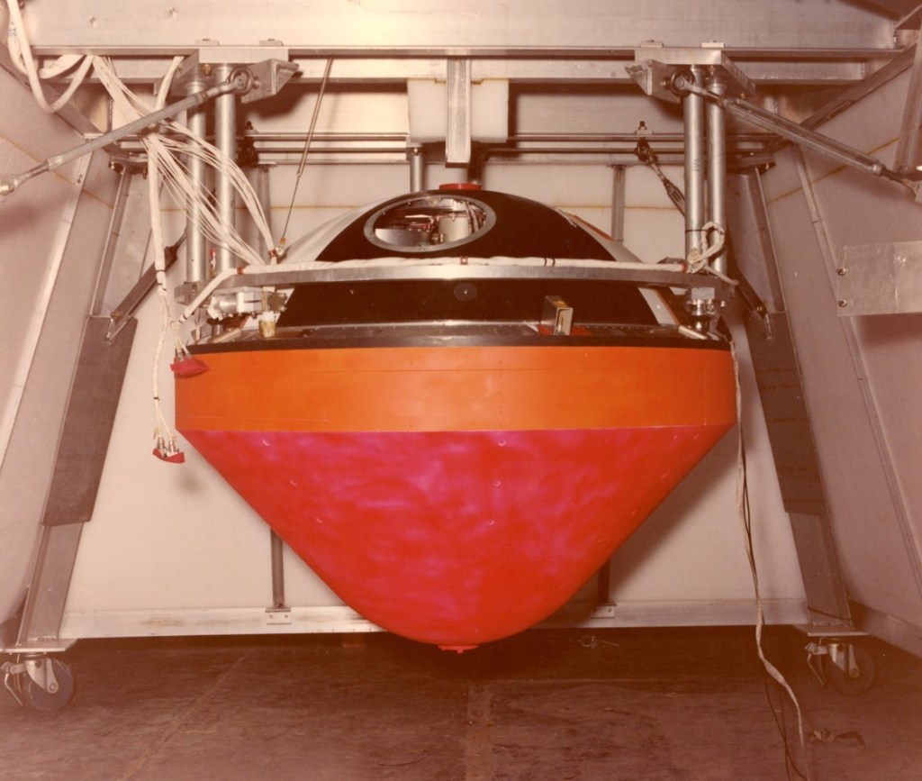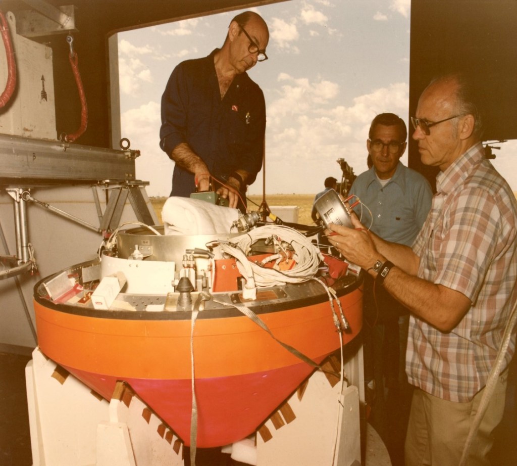 Figure 2 shows the Galileo Atmospheric Probe (GAP) undergoing preparations by NASA contractor personnel for the drop test conducted at White Sands Missile Range. The electronic and optical equipment installed inside the probe was designed to characterize the atmosphere of Jupiter; in addition to standard measurements such as temperature and pressure, atmospheric composition (atomic and molecular gases), electrical activity (i.e., lightning), cloud cover and other features of this exotic planet were also to be ascertained. The large orange conical section below the deceleration module aeroshell (instrumentation section) is the heat shield. The individual standing on the right is likely holding a communications module similar to the unit employed on the live mission.