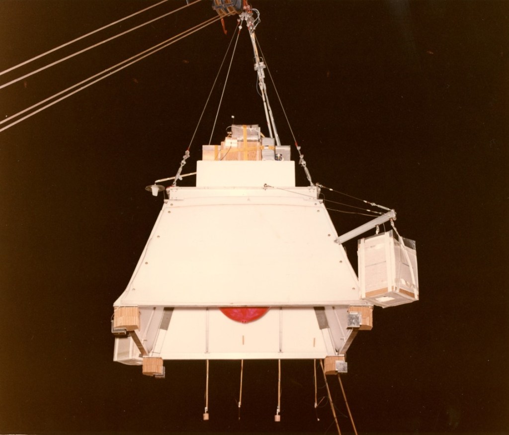 Figure 3 shows a detailed view of the Galileo Atmospheric Probe (GAP) mounted inside its protective shroud prior to being attached to the stratospheric balloon. The purpose of this shroud was to protect the probe from wind damage and other deleterious atmospheric effects prior to the drop event. The GAP at this time is fully assembled prior to liftoff, with the deceleration module aeroshell (instrumentation section) cover in place on top of the heat shield. The cylindrical device partially seen inside the port access window is likely the top of the mass spectrometer used to obtain precise measurements of the Jovian atmospheric constituents during the mission. The small red cylinder at the top of this module is the mortar tube cover for the enclosed descent parachute. The distance from the base of the heat shield to the top of the deceleration module aeroshell is three feet; the maximum diameter of the heat shield is slightly over four feet. The GAP was designed to withstand high levels of electromagnetic radiation as well as deceleration forces of several hundred G’s during entry into the Jovian atmosphere.