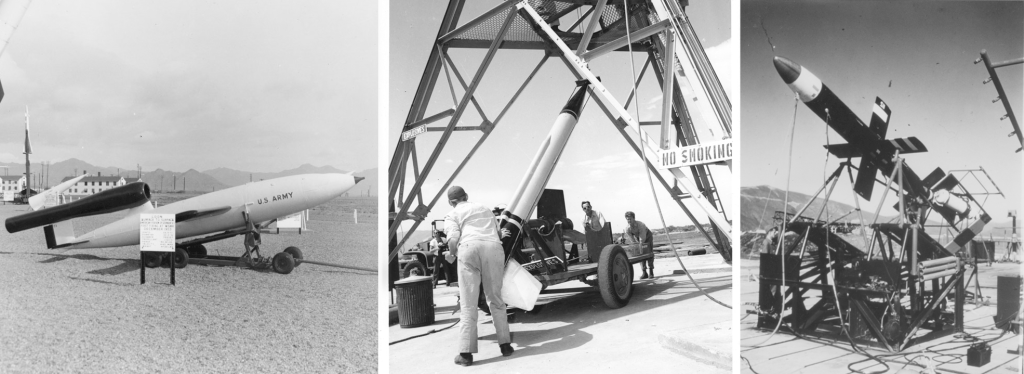 Three of the first missiles tested at WSPG, from left to right: Loon, WAC Corporal, and Lark. WSMR photos.