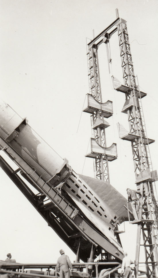 Personnel operate a lift on the V-2 trailer, called a Meillerwagen, to set the rocket into the 100K Static Test Sand near WSPG Main Post.