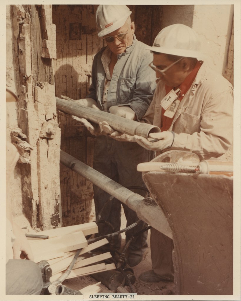 Two LASL scientists who had worked on the original Sleeping Beauty test – Don MacMillan, now N-1 group leader, and Robert Lanter, now W-3 – arrived to watch operations and see what had actually occurred in that bunker nearly 21 years ago. They had been in the old M-3 group which conducted the series of initiator tests. Other members of the test group who are still with the Laboratory include Henry Filip, Jim Runyon and Fred Lujan, N-1; Art Sayer, W-4; and Jim Greenwood, SD-1.