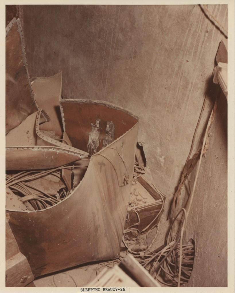 Finally inside the bunker, this copper box revealed the secret of Sleeping Beauty’s failure. This crumpled copper is the remains of the high voltage box that contained electrical equipment, including a firing switch operated by a small explosive charge. The fact that the box had been blown apart by this small charge but that the principal experimental equipment had remained intact meant that the explosive-operated switch had failed in some way to set off the main explosive charge, according to Don MacMillan, a member of the group that conducted the initiator tests. Sleeping Beauty was the only failure of the two tests conducted at Trinity Site and others that were conducted later at LASL.