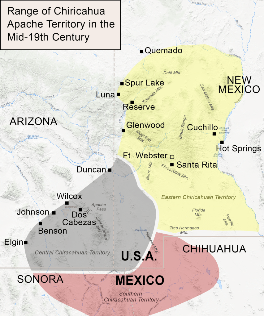 Contact between the Warm Springs people and American traders had been sporadic from Mexican independence until the outbreak of the US war with Mexico; the first contact with American troops in 1846 changed the dynamic of Apache life in the borderlands. This occurred near present-day Silver City where Mangas Coloradas and some of his band met with Brigadier General Stephen Watts Kearney, Topographical Surveyor Lieutenant William Emory and one of Kearney’s scouts, Kit Carson. The period immediately after that first encounter until about 1860 was one of relative peace – at least regarding the Warm Springs people. Other Apache bands continued to regularly raid into Mexico, but the attempted establishment of a temporary reservation and placement of Indian Agents in the area allowed for at least some sense of trust to develop among the Apache and the Americans.