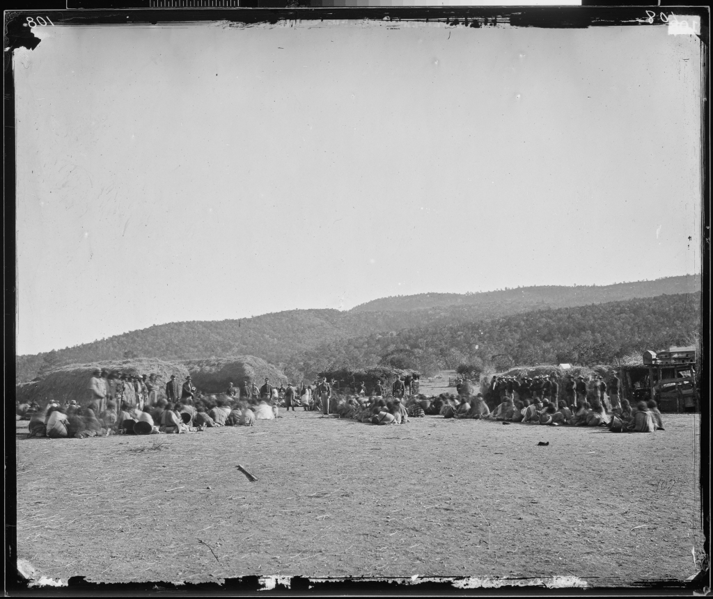 An unprovoked attack on a peaceful village greatly angered many Apache, and the discovery of gold at Pinos Altos brought a rush of settlers – including many Texans – into the area. These new arrivals from Texas had no tolerance for the Apache and believed they should be exterminated. Warm Springs Chief Mangas Coloradas desperately attempted diplomacy throughout this time — trying to ensure the treaty conditions were fulfilled by his people — but was lured into Pinos Alto by miners under the pretense of a friendship agreement, tied to a tree and flogged, then released. This act inflamed not only the Warm Springs people but also Apache throughout the southwest.