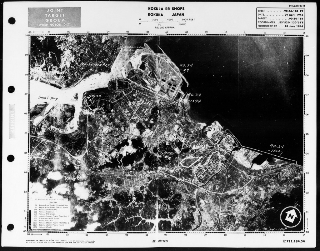 Kokura is an industrial city located on the northernmost point of Kyushu Island and ideally situated on the western bend of the Shimonoseki Strait (Shimonoseki Kaikyo in Japanese, also called the Kanmon Strait). During the Pacific Campaign, Kokura was identified as Target Area No. 90.34 by the Allied Joint Target Group. As the shortest route from Korea and the Yellow Sea to the island of Shikoku and the east coast of Honshu, the cities along the Shimonoseki Strait naturally developed as ideal locations for Japanese industry. In the 1930’s and the early years of the Second World War, the area grew to see the heaviest concentration of shipping in the Far East. In addition to Kokura, the cities in this area included Tobata, Wakamatsu, Shimonoseki, Moji, and Yahata (called Yawata by Allied Intelligence, sometimes confused with Yawata City in Kyoto Prefecture).