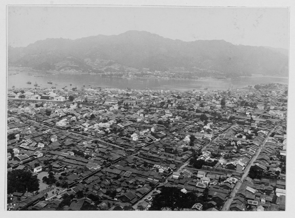 The city itself is generally divided into two primary river valleys, the Urakami Valley, which contains Nagasaki’s core industries, and the Nakashima Valley, which leads down into the eastern part of the city. Due to the mountainous terrain peaked by Mounts Inasayama, Hokazan, and Konpira, there are many smaller valleys that hug the tributary waterways that eventually empty into the two main rivers or Nagasaki Bay. The mountains and hills surrounding Nagasaki also keep the city’s populace confined to the valleys, leading to many fingers of built up areas that reach up into the forested highlands. In order to make the most use of the limited lowland terrain, the people of Nagasaki created artificial islands and reclaimed land around Nagasaki Bay, altering the waterside areas to build shipyards, wharves, and dry docks to support the ever-busy maritime industry. Even with these extra man-made spaces, the city is densely packed. Prior to World War II, an aerial view of Nagasaki would show irregularly shaped blocks of chōme (city districts) capped with the roofs of wooden or tiled buildings, each at a height different than that of its neighbors.