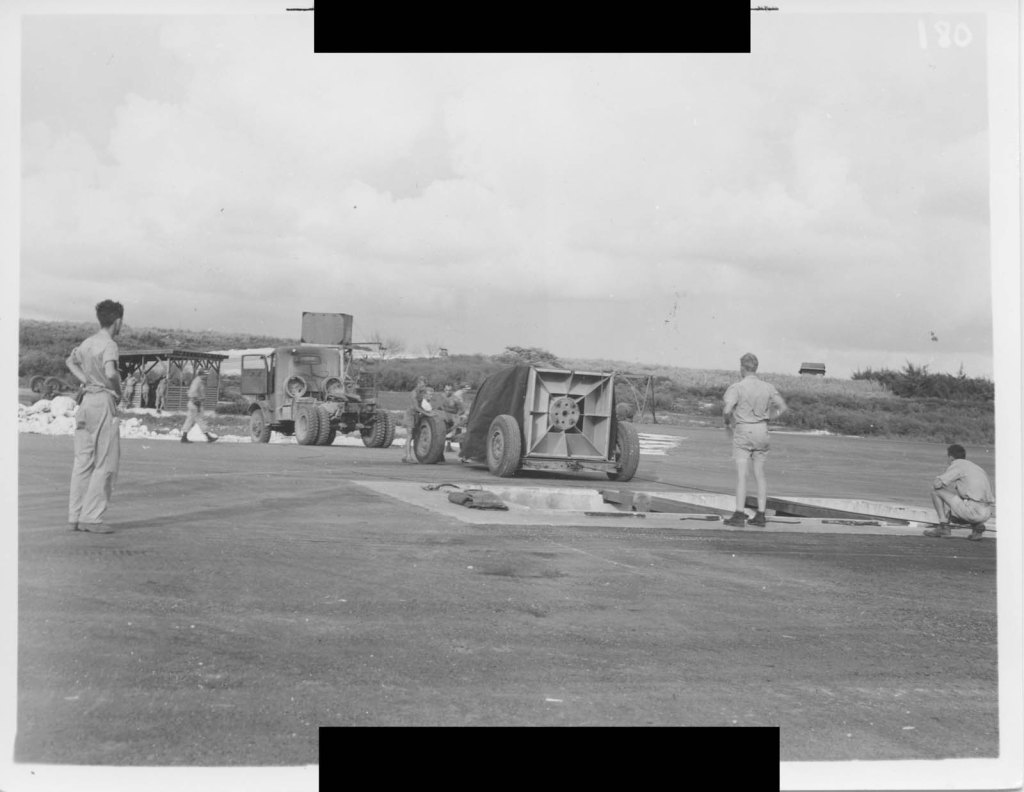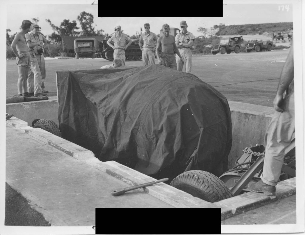 The truck and Fat Man made their way down to the loading pit in a convoy. Although an attack on the atomic bomb was highly unlikely, the Project Alberta personnel were not going to risk anything bad happening so close to Fat Man’s final delivery. Even though Tinian had been cleared of the last of the Japanese garrison, there was always the fear that a lone Japanese soldier, armed with a samurai sword or rifle with bayonet, could burst through the foliage when the Americans least expected it. Near the northern end of the island, crewmen detached the trailer and pushed it by hand to the loading pit. As the loading personnel worked, Military Policemen stood guard around the site with black “MP” bands on their sleeves and M3 “Grease guns” slung over their backs.