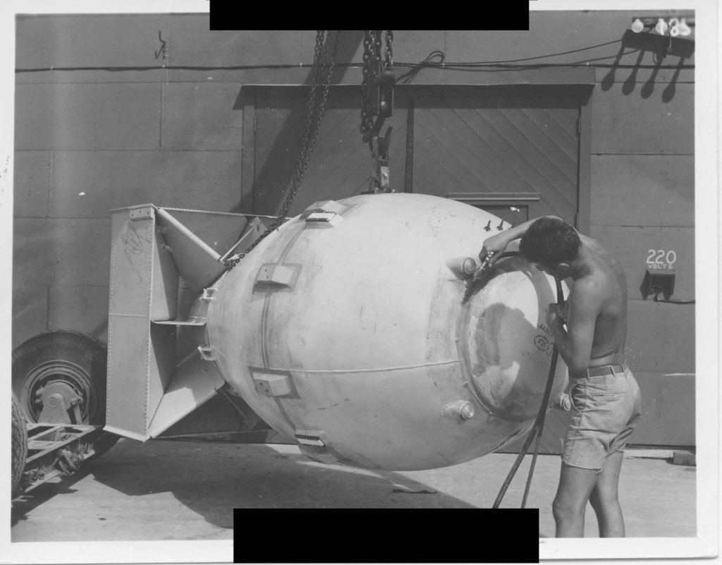 Video of the final preparations show workers applying adhesive strips and several layers of spray-on sealant to the bulbous shell, which emerged from Assembly Building #2 already yellow in color, which came from a painted-on layer of zinc chromate, a carcinogenic salt compound commonly used as a corrosion-resistant primer on metal surfaces. For the finishing touch, Dr. Norman F. Ramsey added his signature to the nose cap alongside other Manhattan Project and Project Alberta personnel and a stencil of Fat Man’s outline labelled “FM.” Just above the stencil was the acronym “JANCFU,” short for “Joint Army-Navy-Combined/Civilian ‘Fouled’ Up” (this being a polite translation). Whether this was simply a succinct observational commentary of how well the mission was going so far or an attempt to ward off bad luck, there is no way the ground crews could have known just how prophetic the stenciled acronym was going to be.