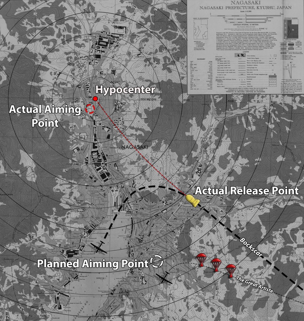 They flew southwest to Nagasaki, almost exactly one hundred miles away if flying in a straight line and reported as being partially covered, only to find the aiming point concealed by clouds as well. At the last minute and with mounting concerns about critically low fuel, there was a break in the cloud cover over the target. Major Sweeney handed over the controls to Captain Beahan, who worked with Staff Sergeant Buckley on the radar set and Captain Van Pelt on navigation, to narrow the guidelines in his sights. They had already flown over the assigned aiming point, located in the heart of the city east of Nagasaki Harbor. Instead, Captain Beahan aimed for a stadium racetrack located along the Urakami River and in between the two Mitsubishi plants. Once aligned, Captain Beahan pressed the release and their five ton payload dropped through the open bomb bay doors. Fat Man was dropped on Nagasaki just after 11:01am local Japanese time from an altitude of around 29,000 feet (8,840 meters). It exploded approximately 47 seconds later at an altitude of around 1,650 feet (500 meters) above sea level.