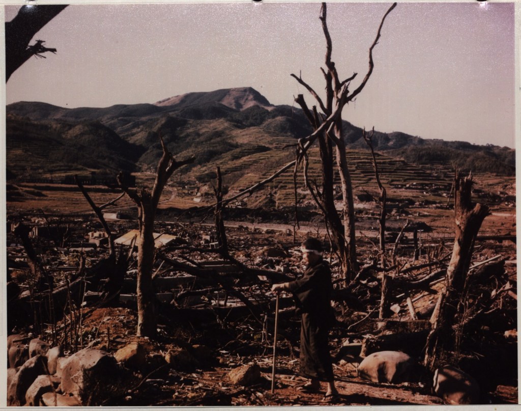 My home was about 0.9 kilometers northwest from the hospital and about 0.5 kilometers from the bomb center. The house had burned and collapsed but the trench underneath it was still in good condition. For a week after the bomb I slept in the trench at night and worked in the college during the day. After a week I moved away to a part of the city about four kilometers from the college and walked everyday back and forth under the midsummer’s sun. My wife had been wounded on her head, chest, and limbs, but had been getting better. But about two weeks after the injury, her temperature went up to 40 degrees Celsius and she became hemorrhagic, and her condition was quite serious. I gave her 250 cubic centimeters of my own blood, but in those days of heavy responsibilities, I did not seem to feel tired. One day at the beginning of September, after walking in the rain to the hospital and back home again, for the first time, I felt quite feverish… My gums became dark purple and there was slight hemorrhage… Actually, I was in bed six days and injected vitamins ABC, liver preparation, and calcium, and ate as many summer oranges as I could get which proved especially effective.