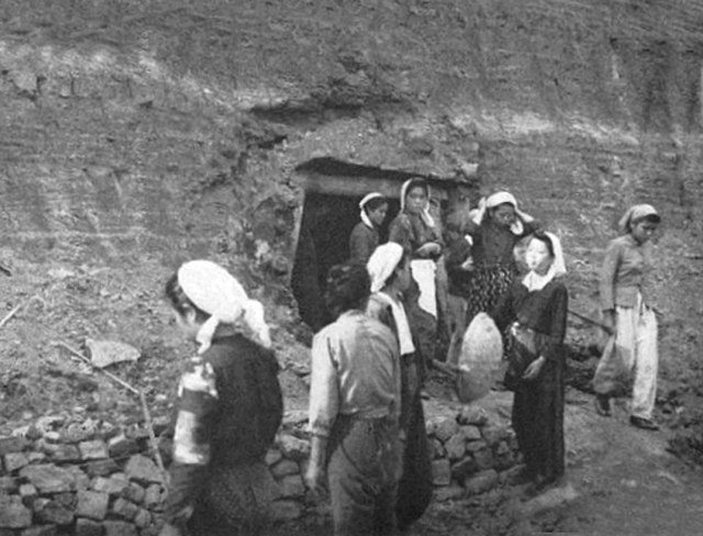 Once outside, this woman made her way to a cave higher on the hillside to avoid the fires of the houses toward the main road. The fires were very intense. The other girl was led to the highway by a young man who did not work in the cave and [was] unknown to them. He [had] come from higher on the hill. Later on, two or three other women joined her in the cave higher up on the hillside. On the way to this cave, she passed several dead or dying people in the rubble of collapsed houses, some of which were on fire. She thinks this was about ten minutes after the explosion.