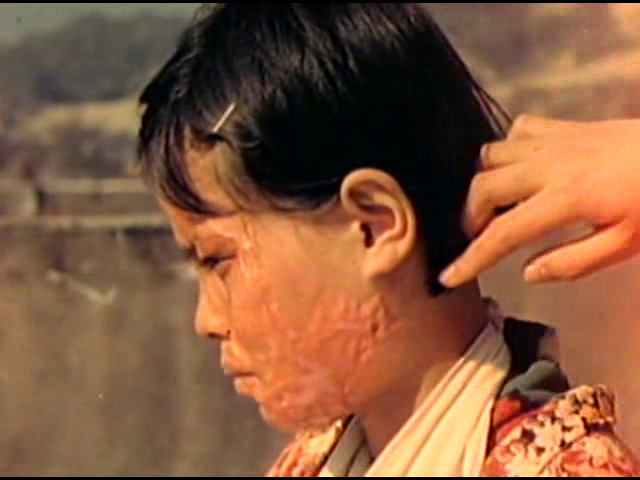 This girl was working with about 60 other men and women in a cave pumping the water out when the bomb exploded. She was about 60 feet inside this cave which was situated near the hill by the prison and about 100 or 150 meters from the bomb center. Around this hill many cave trenches had been built, and she was in the one nearest to the main street on the north side of the hill, facing west. The clothes she was wearing at the time were a blue short-sleeved shirt with red and white dots and blue trousers.