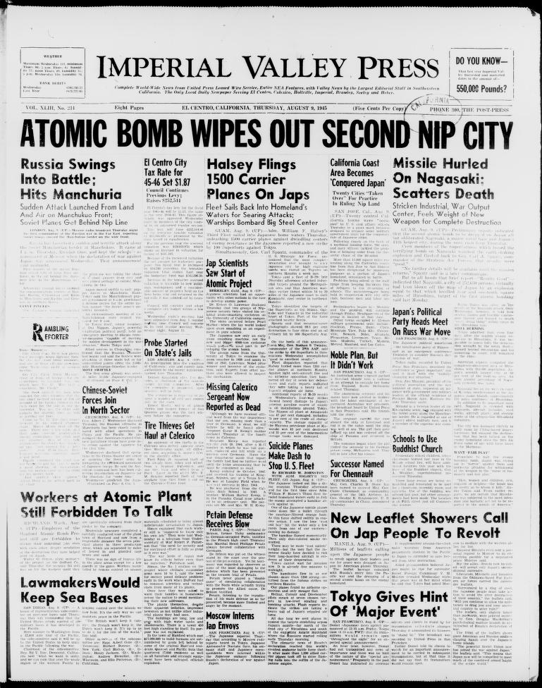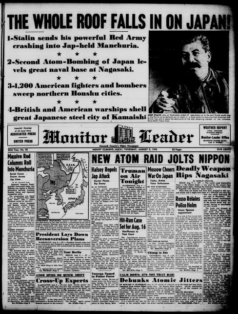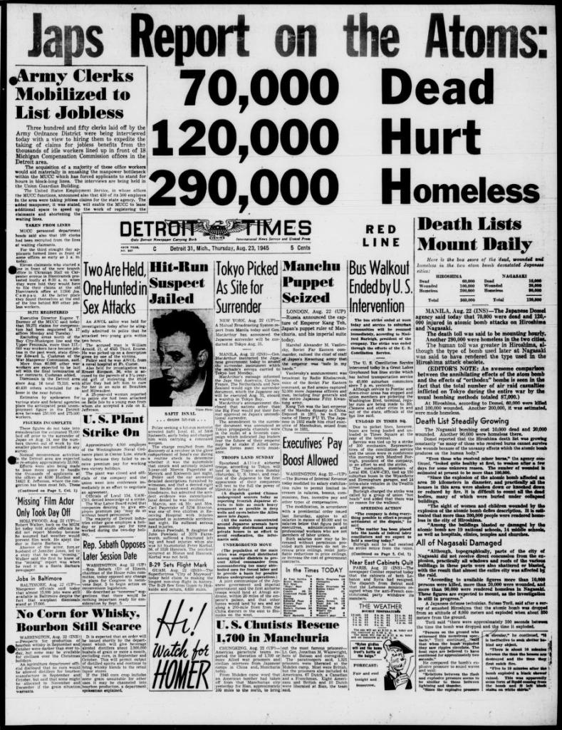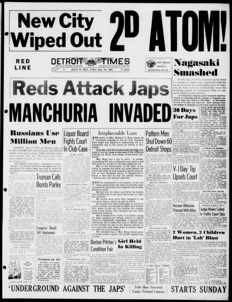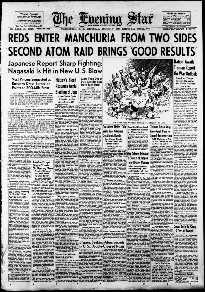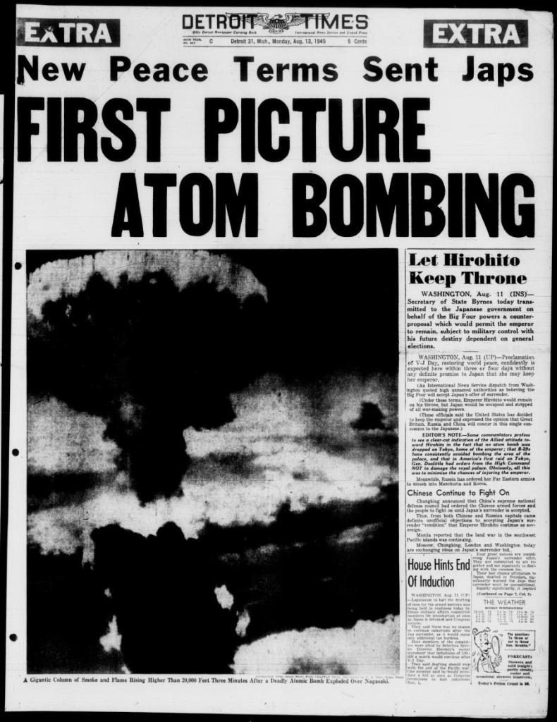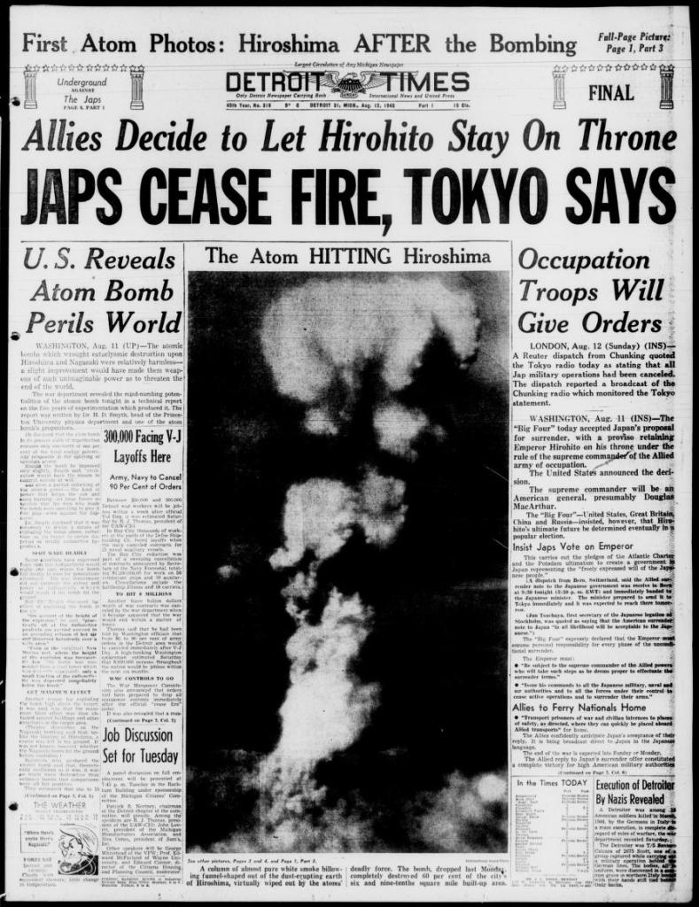 During the middle weeks of August 1945, American newspapers ran front page news of the atomic bombings, the Soviet Union’s entrance into the war against Japan with the invasion of Manchuria, and rumors that the Japanese government was ready to accept the terms of the Potsdam Declaration, albeit with a few caveats related to the status of Emperor Hirohito.