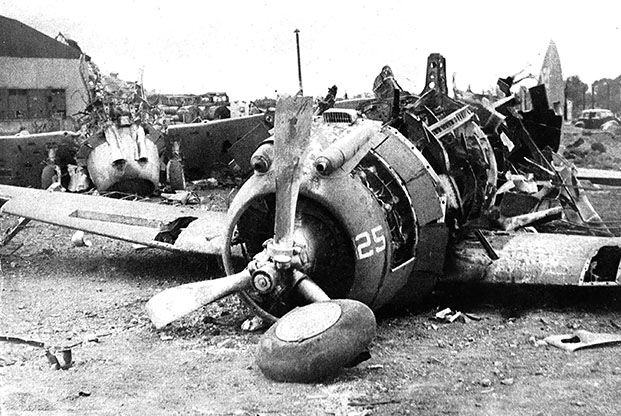 The Japanese, as they told their postwar interrogators, could hardly believe their good fortune. There lay their prey, bunched together, wing tips almost touching. The three [B-17] Fortresses waiting to take off were the first to go; they exploded within seconds of one another. The attackers came in three waves: heavy bombers, dive-bombers, and fighters. The fishtailing bombs were terrifying, but the strafing Zeros inflicted greater damage. Coming in low, they ignited one fuel tank after another with tracer bullets. As these blew up, the operations office, the field’s headquarters, and the fighter control shack erupted in flame. By 1:37 P.M., when the last Japanese place soared away, Clark was unrecognizable.