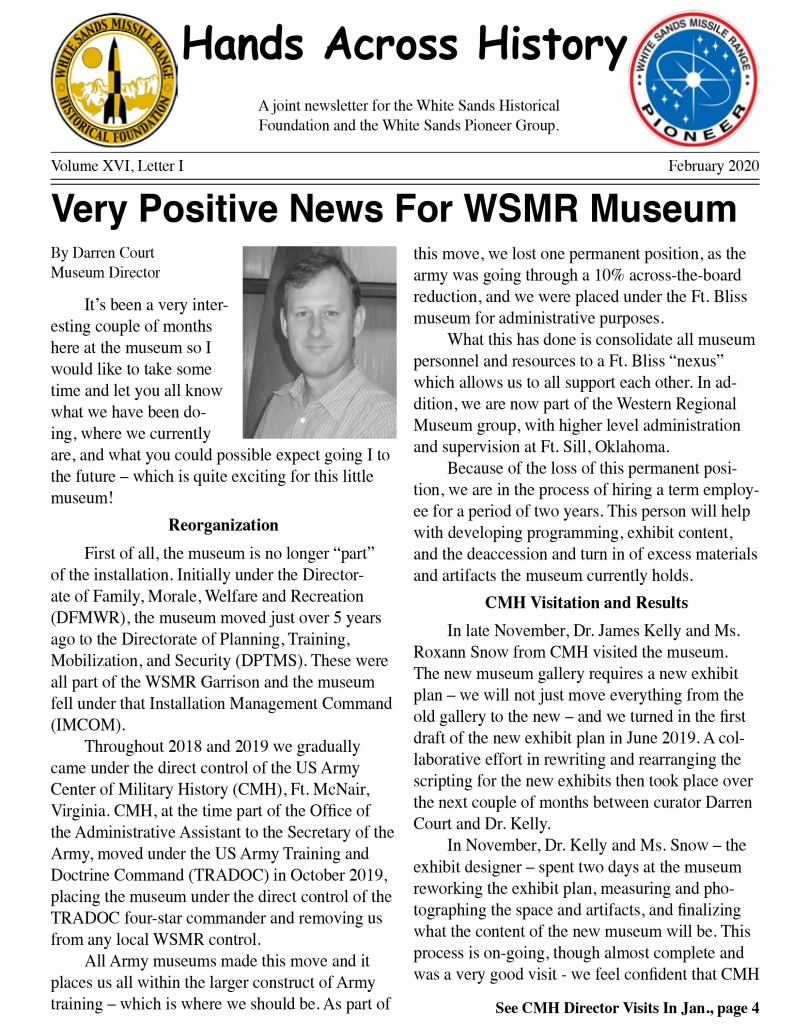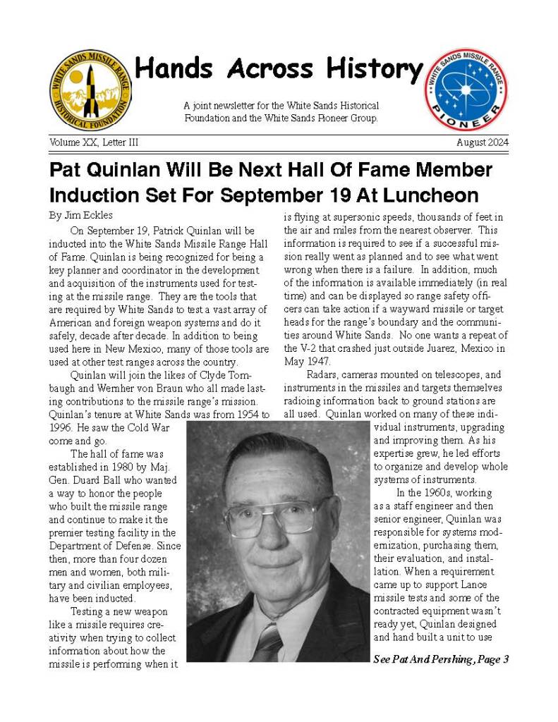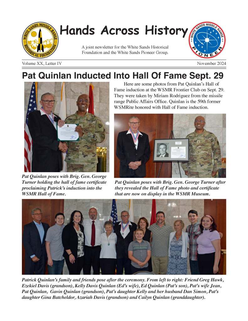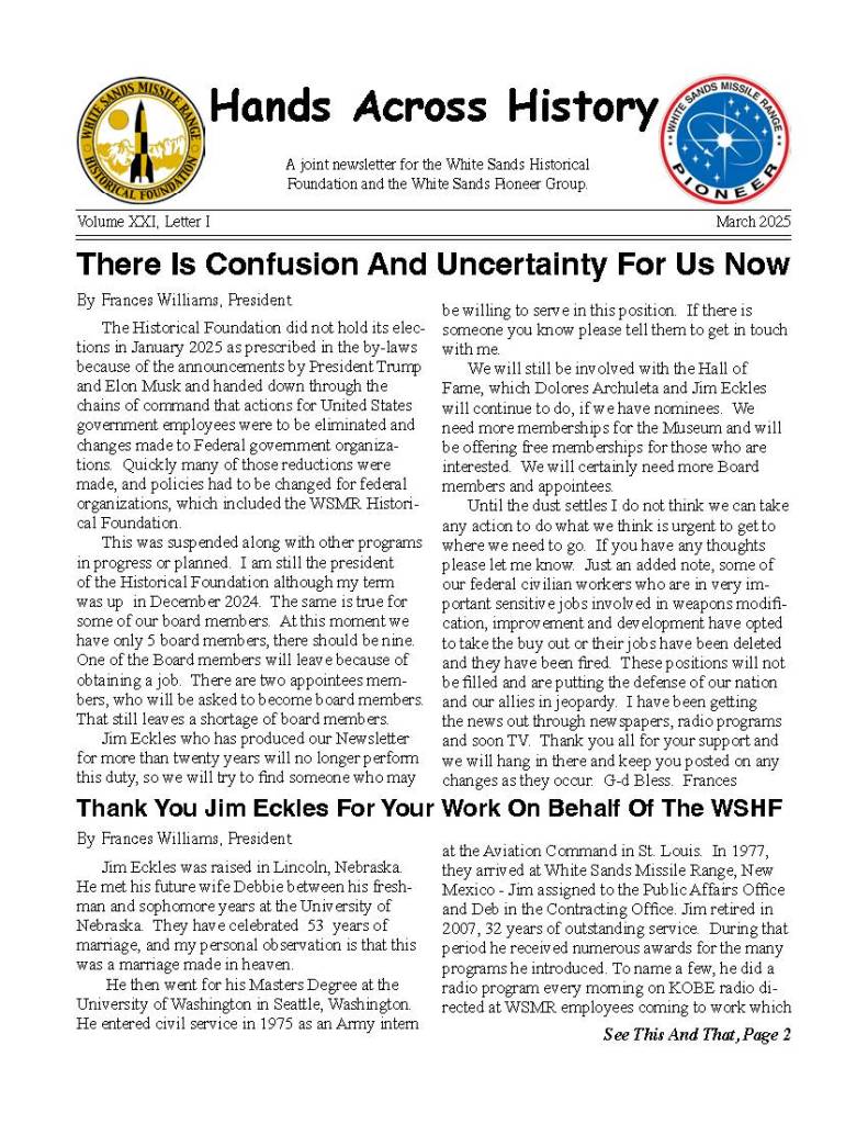 The “Hands Across History” Newsletter is published by the White Sands Missile Range Historical Foundation, a nonprofit organization that aims to preserve the accomplishments of White Sands Missile Range. The newsletter is intended to keep our members informed about current events and share information of common interest. The editor is Jim Eckles. He can be contacted by email at nebraska1950@comcast.net. Membership is open to anyone who shares its goals.