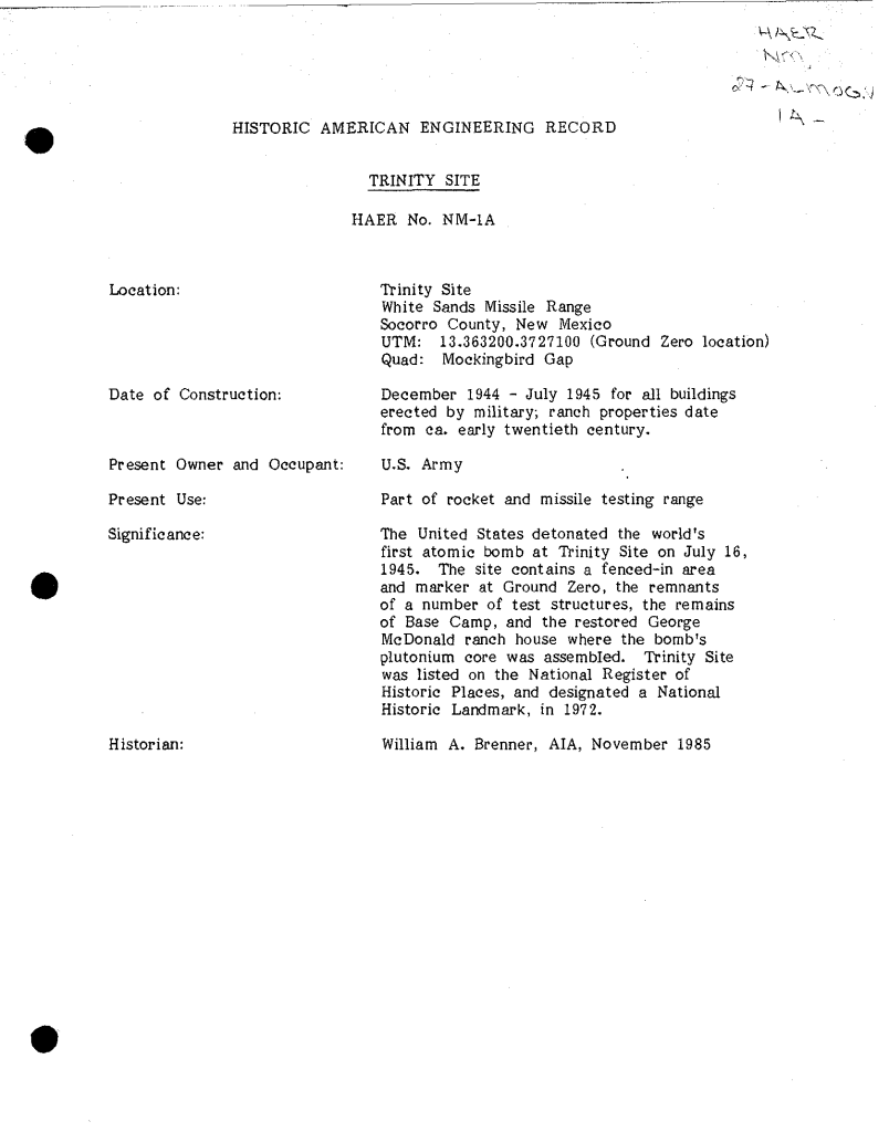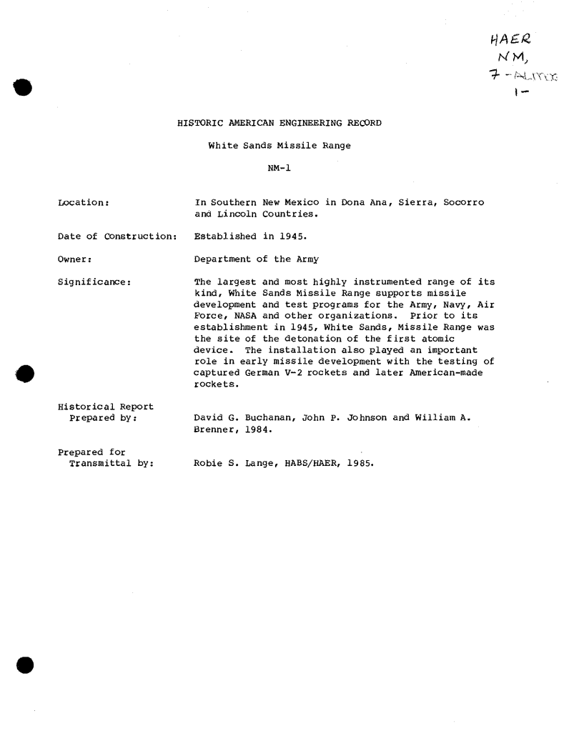 HAER No. NM-1: White Sands Missile Range and the Utah Launch Complex
