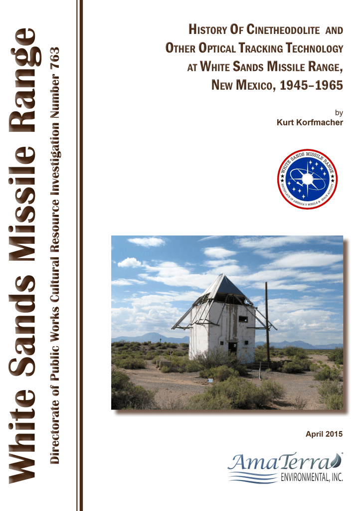 White Sands Missile Range, established as White Sands Proving Ground in 1945, manages an extensive inventory of buildings located at specific sites across the length of the Range. Over the years, these buildings have hosted a variety of instrumentation dedicated to tracking, recording, and analyzing rockets and missiles in flight and their behavior. While most of these sites have been catalogued in some fashion, the history behind the specific technology of the instrumentation has not been previously documented. This report covers specific building types used to shelter these instruments from the often adverse environmental conditions present in the Tularosa Basin. Through the development of a historic context covering the development of cinetheodolite technology from 1947-1963 and a discussion of building property types, this report intends to add to the general body of knowledge regarding these instruments to better understand their place in the history of the Range, and to assist in the evaluation of the various buildings for historic significance and eligibility for listing in the National Register of Historic Places.