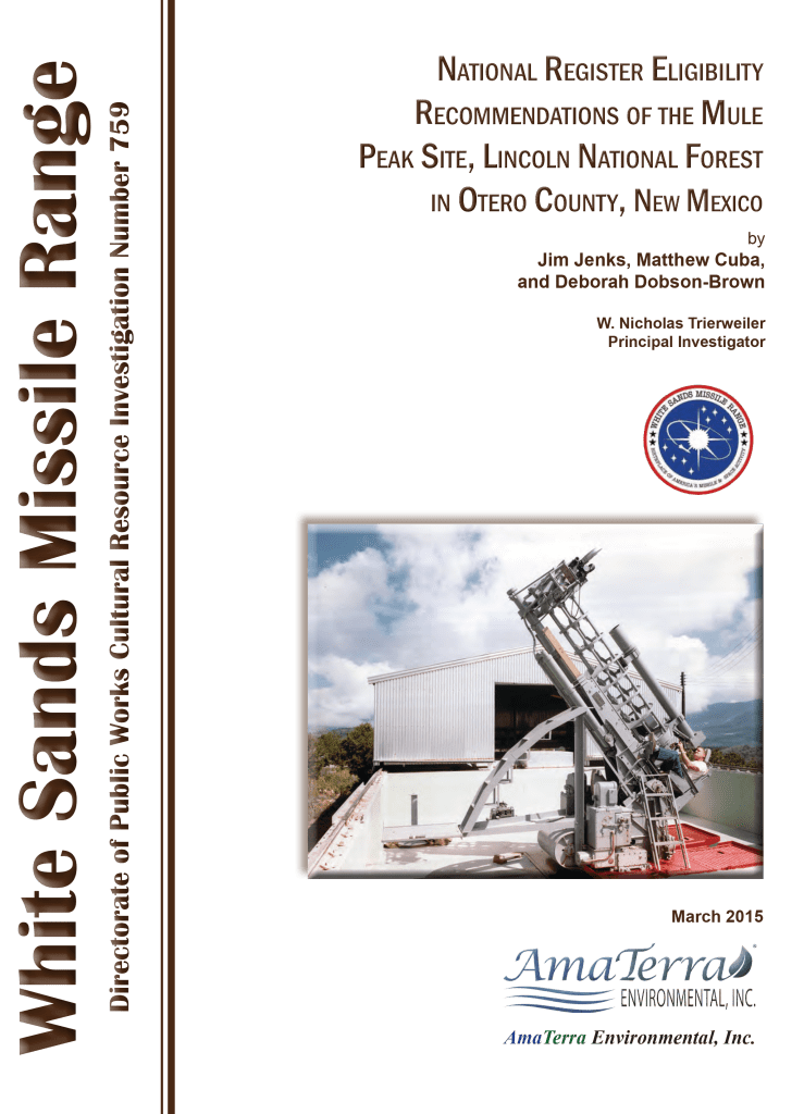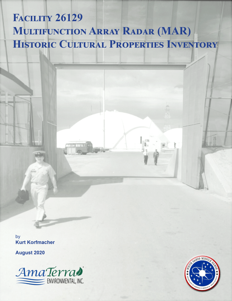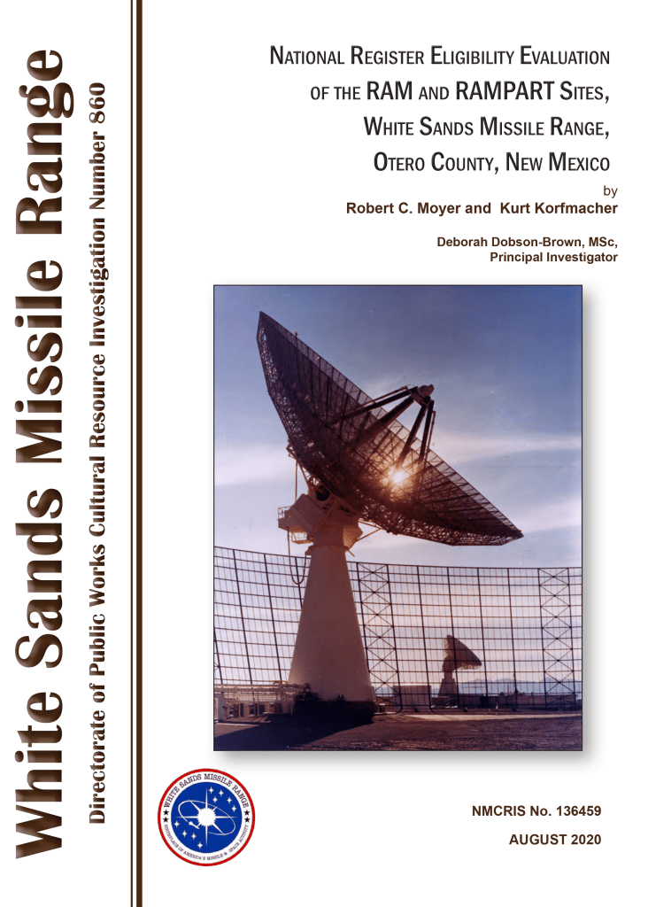 In July of 2016, AmaTerra conducted a cultural resource survey of the Radar Acquisition Measurements (RAM) and Radar Advanced Measurements Program for Analysis of Reentry Techniques (RAMPART) sites at White Sands Missile Range in Otero County, New Mexico. The investigation was designed to inventory any historic properties situated at the two sites and to assess their eligibility for inclusion in the National Register of Historic Places outlined under Sections 106 and 110 of the National Historic Preservation Act of 1966, as amended (16 ASC 470).