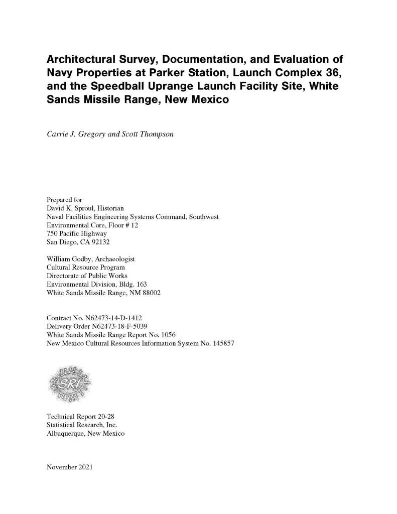 Architectural Survey, Documentation, and Evaluation of Navy Properties at Parker Station, Launch Complex 36, and the Speedball Uprange Launch Facility Site, White Sands Missile Range, New Mexico