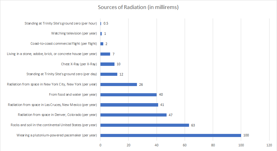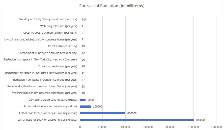 The second chart shows the same radiation sources as the first chart, but this one compares those sources to levels that can result in radiation sickness and radiation poisoning. It is very important to note the different amounts of exposure time when comparing sources and doses of radiation. Data regarding radiation sickness are according to the Centers for Disease Control and Prevention’s Radiation Thermometer.